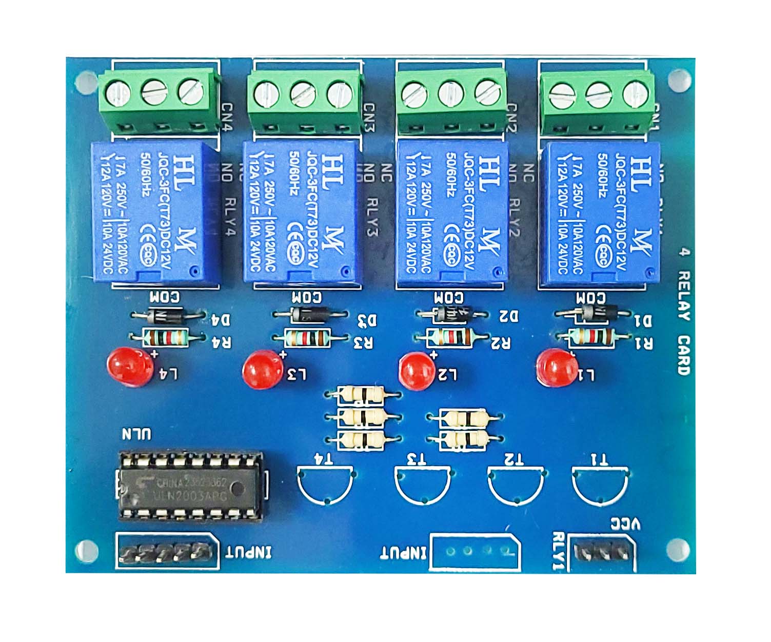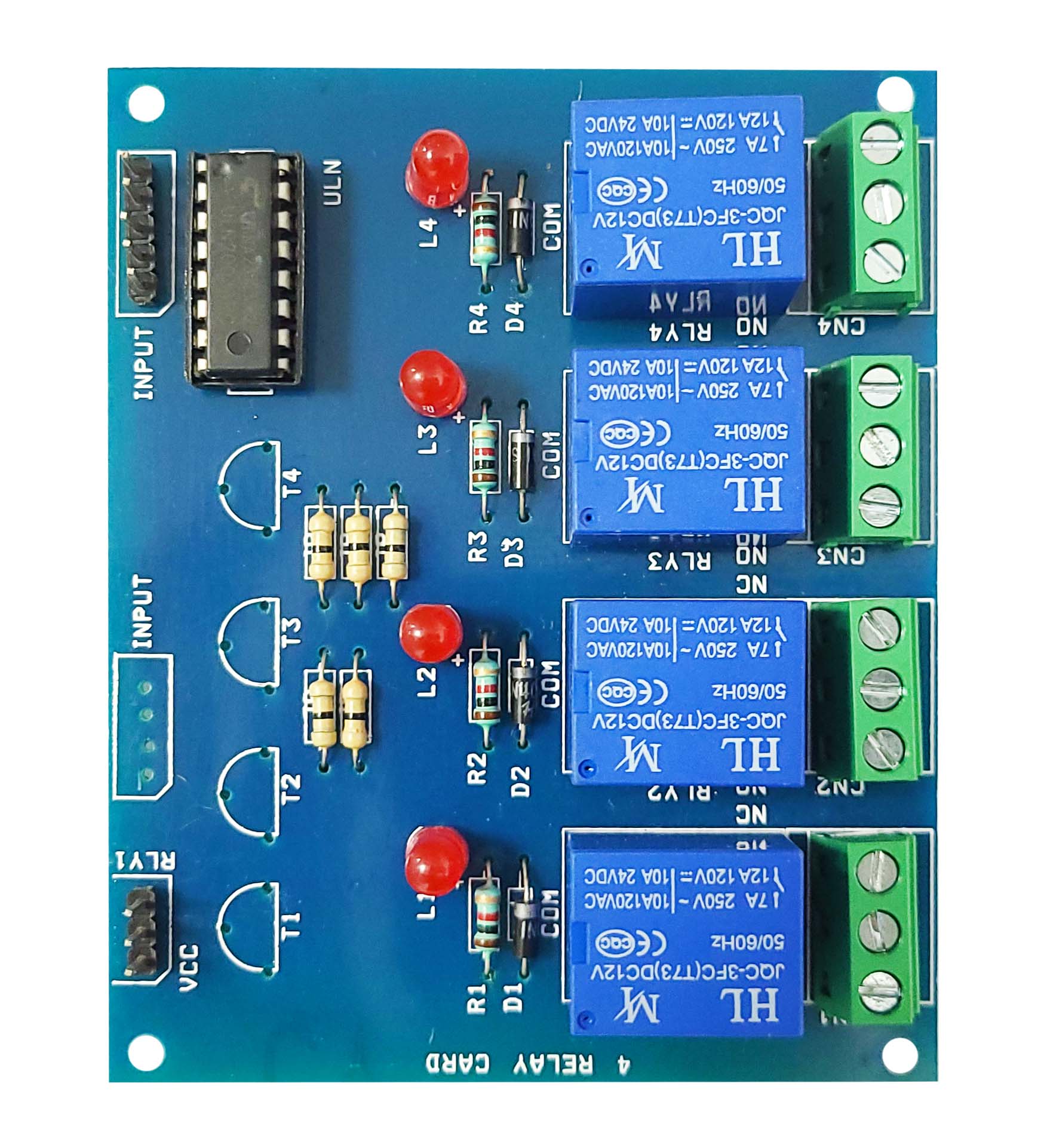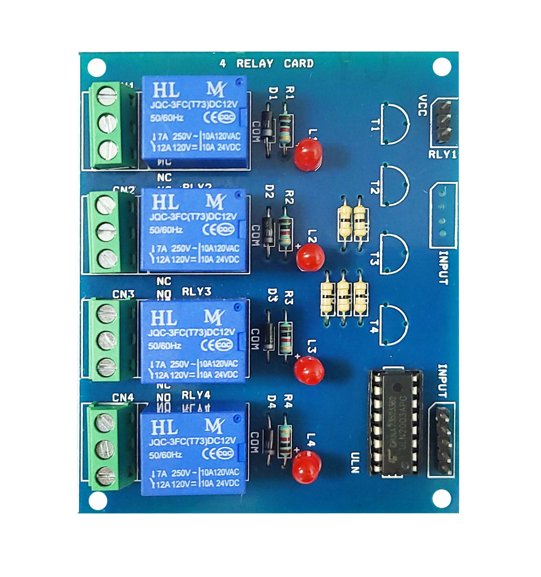 A 12V relay module with four independent channels, enabling you to