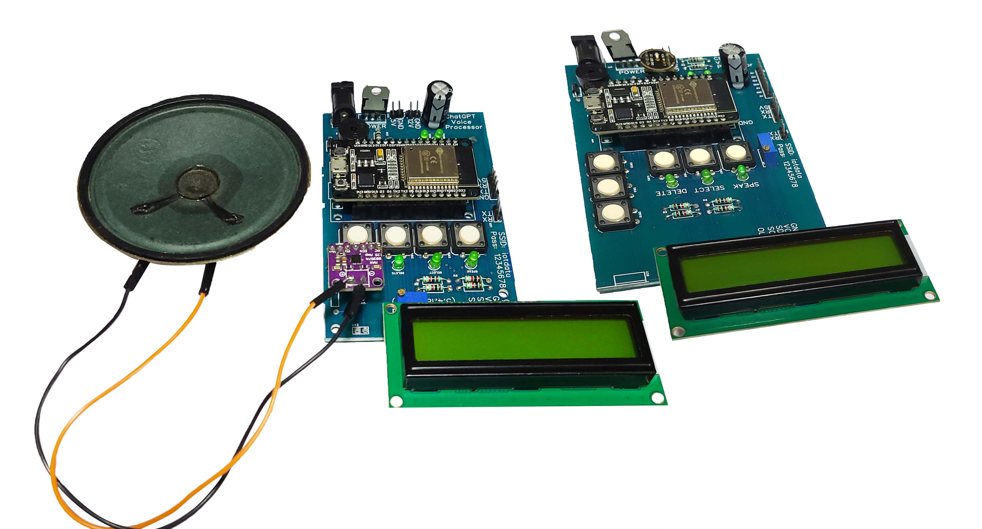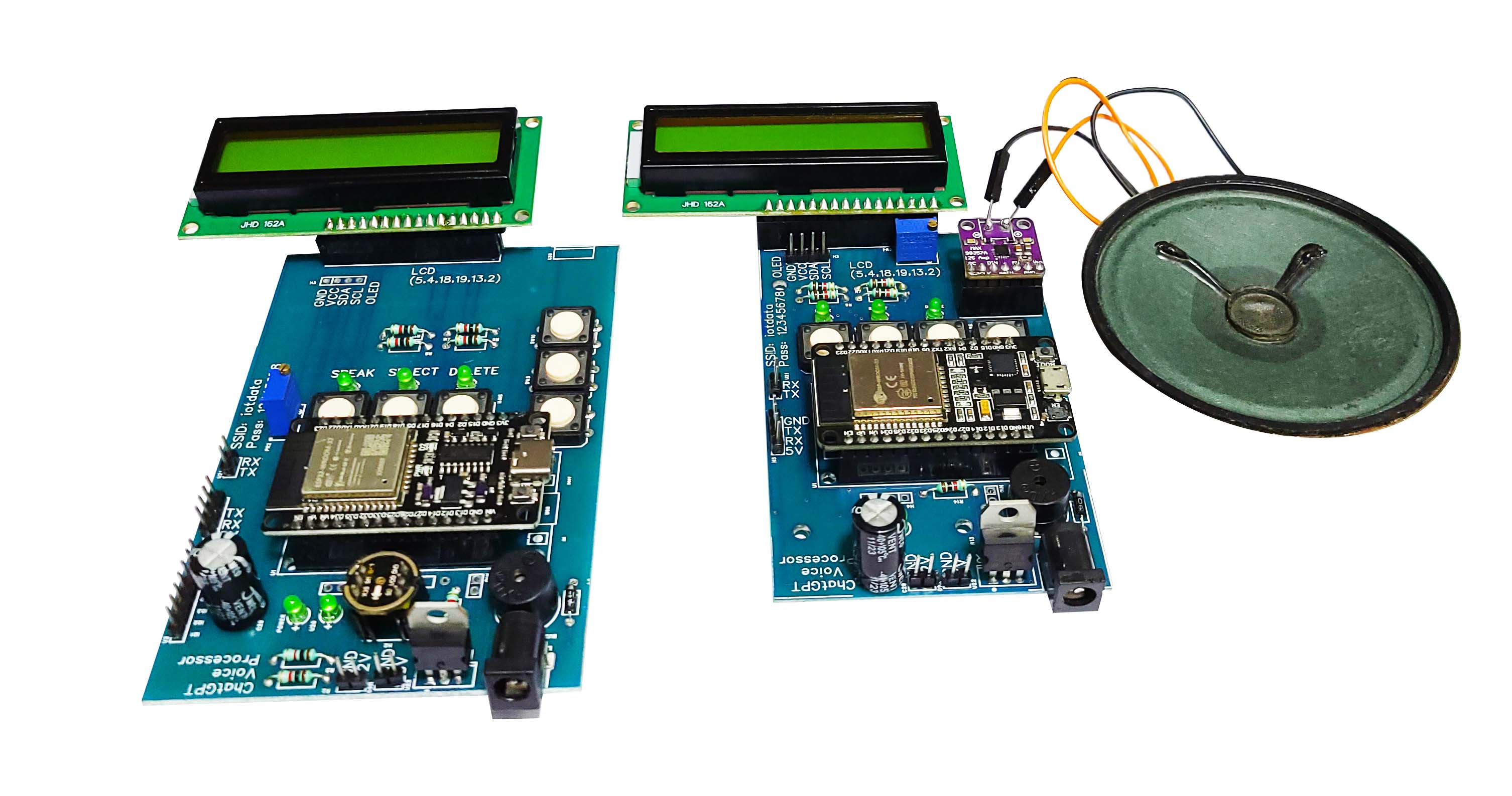 ChatGPT Voice Processing Module is a hardware ChatGPT Server Interacting Module, by connecting to the Wi Fi network or mobile hotspot. The ChatGPT Transmitter Voice Processing hardware unit consist of a Speech to Text Converter, it will analyze the speech and convert it into text, This Converted text will 'Post' in ChatGPT server and the Reply from the ChatGPT server will be send to the ChatGPT Receiver Voice Processing Module will 'get' to the ChatGPT Voice Processing Module receiver and this reply text will be converted as text to speech and played in the Speaker